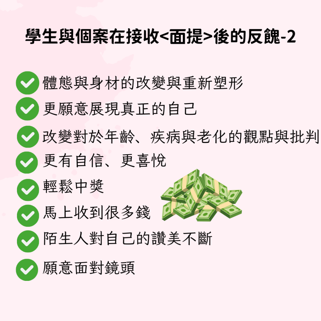 記得我第一次為個案作面提時,我讓自己與個案保持臨在,並不斷提問:「我可以成為什麼能量與貢獻來執行對這個身體最有滋養的面提?」 接著我就進入到一種類似深度冥想的狀態裡,並經驗到無比喜悅的狀態。我感知到正在接收面提能量的身體整個敞開了、輕鬆了、開心了….,隨後我就經驗到一種無條件的愛在我們兩人之間湧現。 結束之后,這位個案笑容滿面容光煥發的,顯得非常開心,整個人都不一樣了! 怎樣比這更好呢!